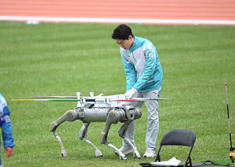 11月19日,志愿者从机器狗身上取下了标枪。当日,第十五届全运会田径项目女子七项全能比赛在广州举行。新华社记者 邓华 摄