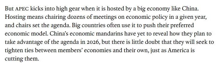 近日,英国《经济学人》周刊网站发表文章称,在美国贸易政策存在不确定性的背景下,中国正在采取一系列经济外交行动,让亚洲国家乃至世界看到并相信中国是一个更加稳定、可信的经济伙伴。文章称,美国不断“撤退”,收缩经济合作范围,而中国则与更多国家签署或升级自由贸易协定。文章指出,2025年,中国与东盟正式签署自贸区升级3.0免费版。 2026年底,亚太经合组织第三十三次领导人非正式会议将在中国举行。占世界经济总量五分之三的经济体成员的代表将齐聚中国。在当前国际经济格局存在不确定性的背景下,中国正在积极行动积极追求更加开放的经济合作,表现出与美国完全不同的经济伙伴态度。 《经济学人》文章截图称,当APEC峰会在中国举办时,其运作效率将大大提高,这也意味着明年该组织的一系列经济主题会议将在中国举行。尽管峰会议程尚未确定,但毫无疑问,中国将寻求加强其成员国的经济关系,而美国则削弱其关系。文章还认为,中国在人工智能和应对气候变化这两个关键领域与美国存在明显不同。美国一直自豪于自己“赢得了人工智能竞赛”,而中国的人工智能发展正在努力推动国际合作,有望造福包括南半球在内的世界人民。在气候问题上,中国也发挥了负责任的作用,通过了切实可行的减排目标。相比美国政府声称的“全球变暖是一场冒险”,中国提出的这些目标显然更具吸引力。