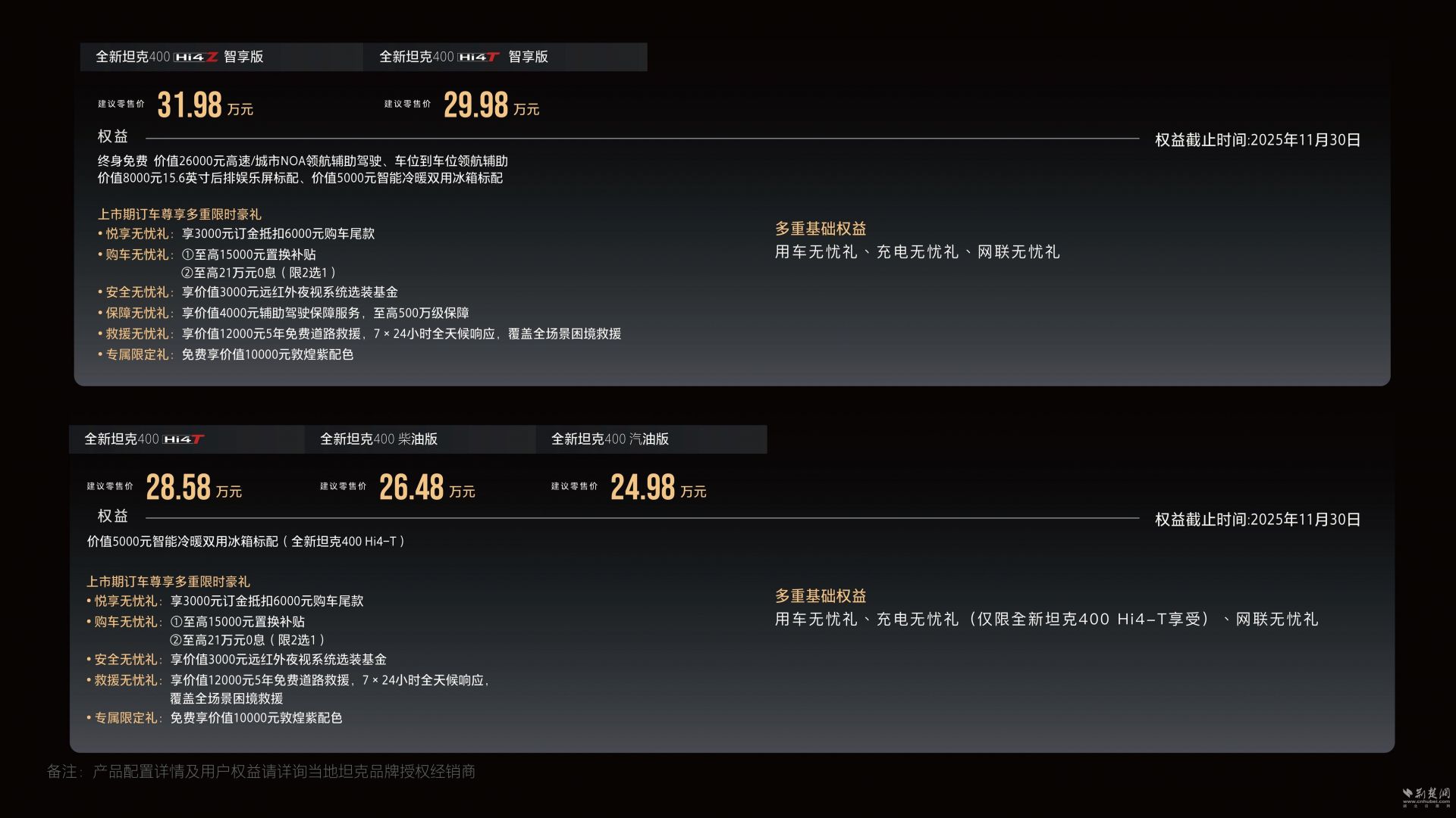 新款坦克400 HI4-Z智能版售价31.98万元;新款坦克400 HI4-T智能版售价29.98万元;新款坦克400 HI4-T售价28.58万元;新版坦克400柴油售价26.48万元;而新款汽油版坦克400售价为24.98万元。今天下订单即可享受多项优惠。坦克充满忠诚,带来购车优惠让年轻用户体验酷炫越野。